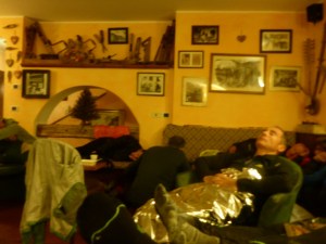 I entered the hotel and headed downstairs where I found a dozen runners spread out on couches and chairs under their emergency heat blankets. A selection of wet gear was toasting by the fire, giving off a ‘delicate’ aroma around the room. I found a chair near the fireplace and started removing my outer layers. Chunks of ice and packed snow fell off my base layer, signalling to me that my core body temperature needed some work. The hosts of the hotel offered to let me sleep in one of the rooms, but I didn’t know how long we would be stopped for and my priority was to get my clothes dry, so I declined. It was like the hunger games – I hung my things in the tiny free spaces by the fire, but then had to sit there to make sure they didn’t get shoved aside by the incoming runners. Joel arrived soon thereafter and Jess about half an hour later, heading off to one of the rooms for some sleep. I wondered if I had made the right decision by forgoing the chance to rest….