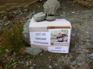 As I approached Rifugio Sogno di Berdze, I noticed some signs ahead cheering on someone named ‘Stephanie’. It didn’t hit me until I got closer that the signs were for me!  During my recce in August, I had stayed at Sogno for a night, and the owners and their friend Cassandro had taken it upon themselves to make a whole series of signs for me leading up to the mountain hut. By the time I got there, I was in tears. It was incredible – a true example of the warmth and kindness of the people in Valle d’Aosta. I couldn’t believe that people who didn’t even know me would go out of their way to encourage me along my journey. With some hugs and a few more tears of gratitude, I headed up to Fenetre di Champorcher and made the long descent down to Chardonney, where Jose and Corrado were waiting with pizza. Pizza!!!