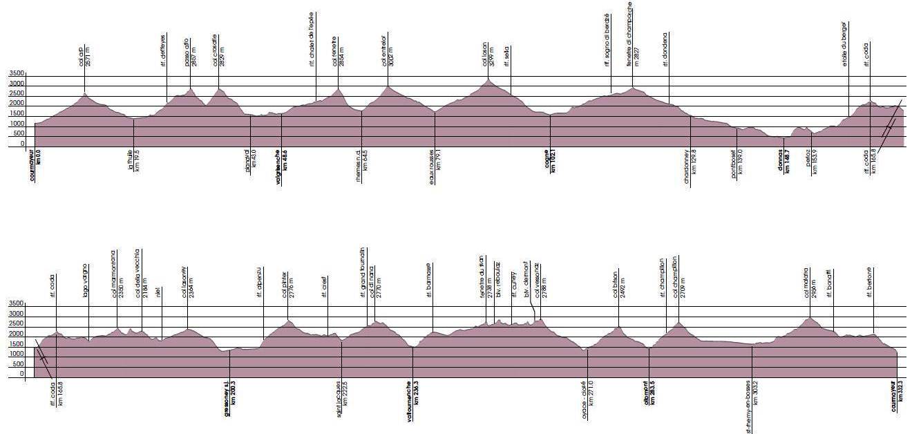 Tor des Geants (Tour of Giants or TDG) is a beast of a race. Competitors have 150 hours to complete 330km and 24000m of vertical climb through Aosta valley in North-West Italy, starting and ending in Courmayeur. Of the 20+ peaks, seven reach above 2800m with the highest climb reaching 3300m (Col Loson).