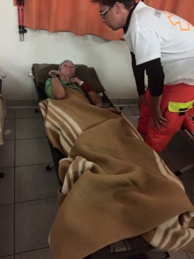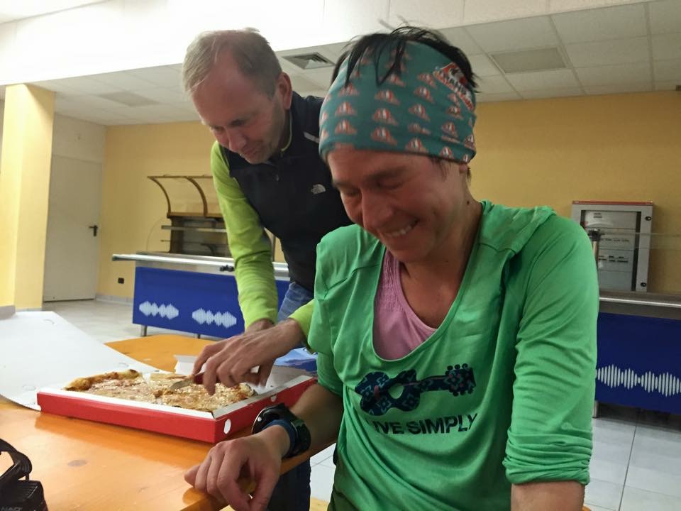 After too many hours of sleep, I got up to move around. I was worried that we were getting way too much downtime and that the body would start to think the race was over. It is better to keep the body in ‘go mode’ than to get too much rest. Everything was swelling and I was losing my mojo… I practised running around the hall we were sleeping in, much to the amusement of the volunteers. Just as I was completing my third little jog around the wooden tables, I looked up and saw Jose coming towards me. She and Corrado had decided to spend the night sleeping in their car, just so that they would be there when I woke up. I could not believe it.